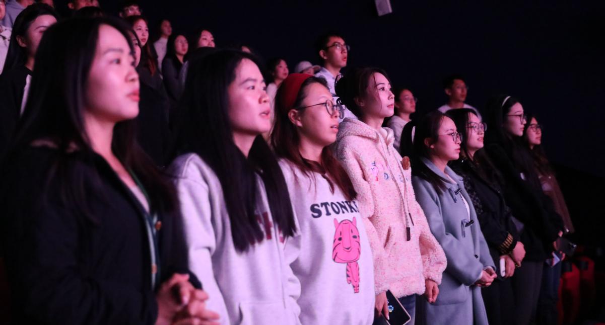 影片结尾,在座师生有感而发,自觉跟随电影中的旋律唱响《没有共产党就没有新中国》。嘹亮的歌声,唱出了广大师生对中国共产党的衷心拥护,唱出了中华儿女跟党走的坚定信念。歌声回荡在影厅的每一个角落,也深深烙印在每一位师生的心中。
