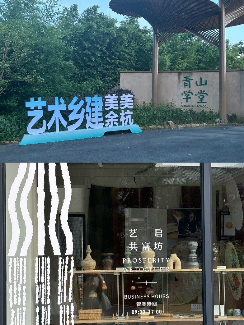 首先,实践团一行来到全国首个未来乡村实验区——杭州市余杭区青山村,先后考察了龙坞水库、青山自然学校、青山青年社·龙坞里、融设计图书馆、艺启共富工坊等地,实地感受了青山村在新老村民的众创共治下走出的一条以“自然保护+生态旅游”、“传统手工艺+文创”和“研学教育+团建服务”为特色的乡村共同富裕之路。