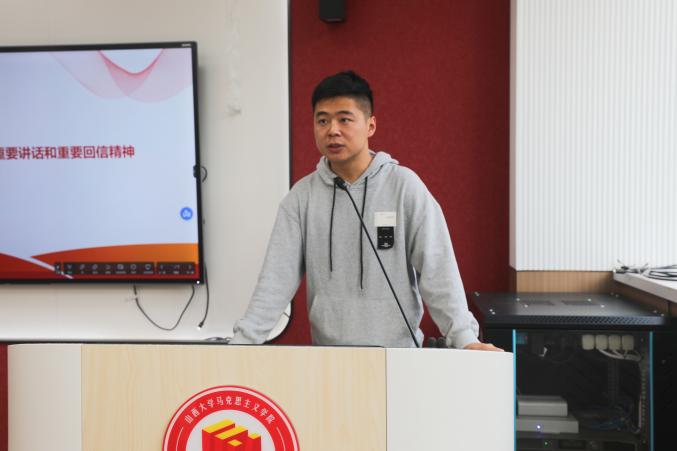 研究生会学研部王阿超同学以“青春有我,奋斗强国”为主题,围绕习近平总书记《激励新时代青年在中国式现代化建设中挺膺担当》重要讲话,从新时代青年运动主题、青年政治引领、青年挺膺担当以及共青团自身建设四个维度出发,详细阐释了青年在中国式现代化建设中的神圣使命和共青团的职责,充分展现了青年挺膺担当、奋勇向前的精神风貌。
