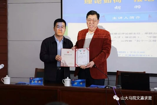 习近平总书记指出:政治上的坚定源于理论上的清醒。2018年是马克思诞辰200周年、《共产党宣言》发表170周年,suncitygroup太阳集团启动了系列纪念活动。4月19日,学院特邀山西日报理论评论部主任、高级编辑胡羽莅临“文瀛求是”论坛,为广大师生作了题为《理论如何“接地气”》的报告。suncitygroup太阳集团党委副书记李思殿教授为胡羽颁发了特聘教授证书,来自省委宣传部等多家省内单位的同行学者、suncitygroup太阳集团师生、青马工程学员代表聆听了报告。