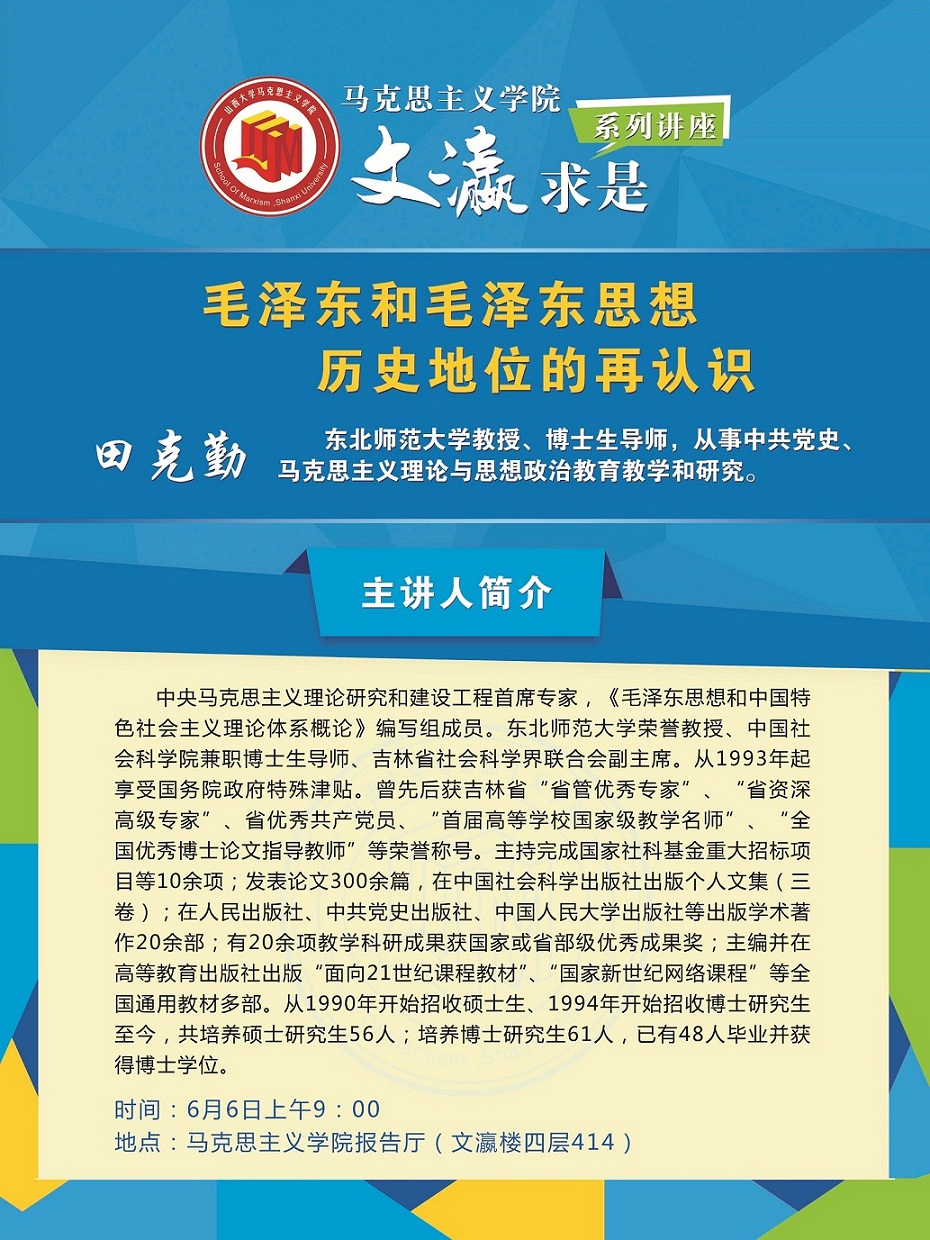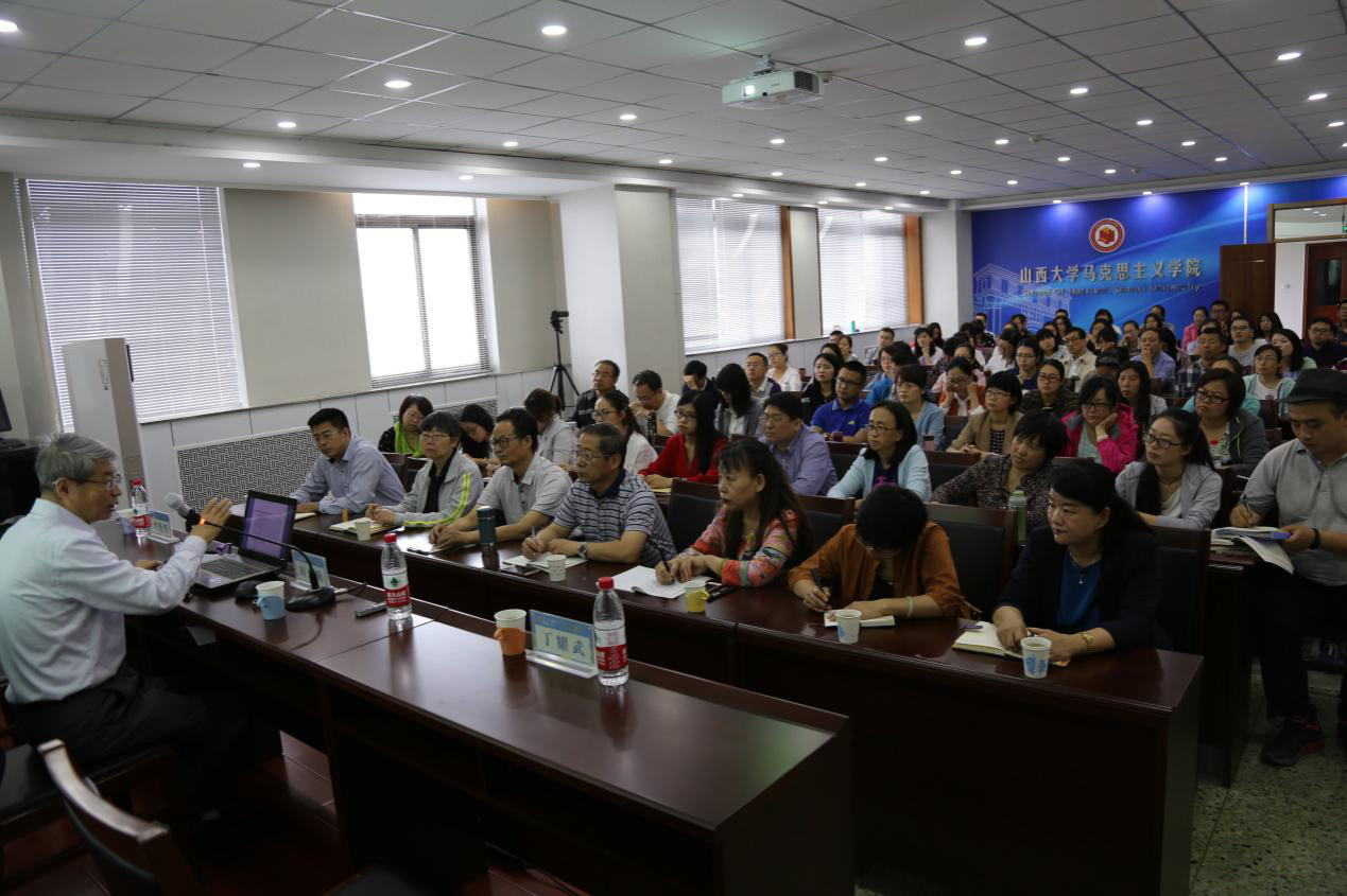 为贯彻落实“2017年高校思想政治理论课教学质量年”工作部署,进一步提升公司思政课教师理论素养与教学水平,suncitygroup太阳集团邀请中央马工程首席专家、东北师大荣誉教授田克勤来学院“文瀛求是”论坛,作了题为“毛泽东与毛泽东思想历史地位再认识”的报告。学院全体教师和来自山西医科大学、太原科技大学、晋中学院等省内10多所高校的思政课教师聆听了报告。