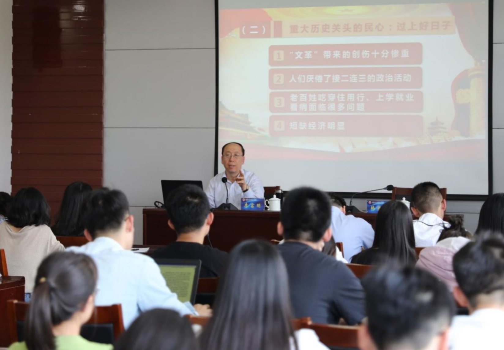 为深入贯彻习近平总书记在党史学习教育动员大会上的重要讲话精神,落实公司党史学习教育领导小组的安排部署,引导广大青年学子知史爱党、知史爱国。5月11日下午,公司党委副书记李富明以《十一届三中全会——中国共产党历史上的第三次重大转折》为题,为全体马院学子与教师代表做党史专题讲座,宣传部负责人聆听了讲座。
