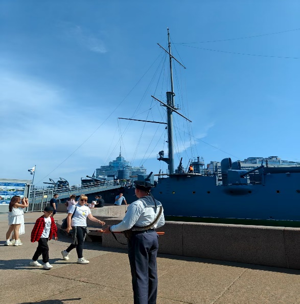 登上停泊在涅瓦河畔的阿芙乐尔号巡洋舰。抚摸着历经风雨的舰首大炮,同学们聆听了关于11月7日晚起义信号发出的细节描述。从彼得格勒工人的武装起义到攻克冬宫,大家在甲板上开展了生动的现场教学,深刻认识到这声炮响不仅是资产阶级临时政府覆灭的见证者,更是世界上第一个社会主义国家诞生的报信者,人类历史由此进入了新的纪元。